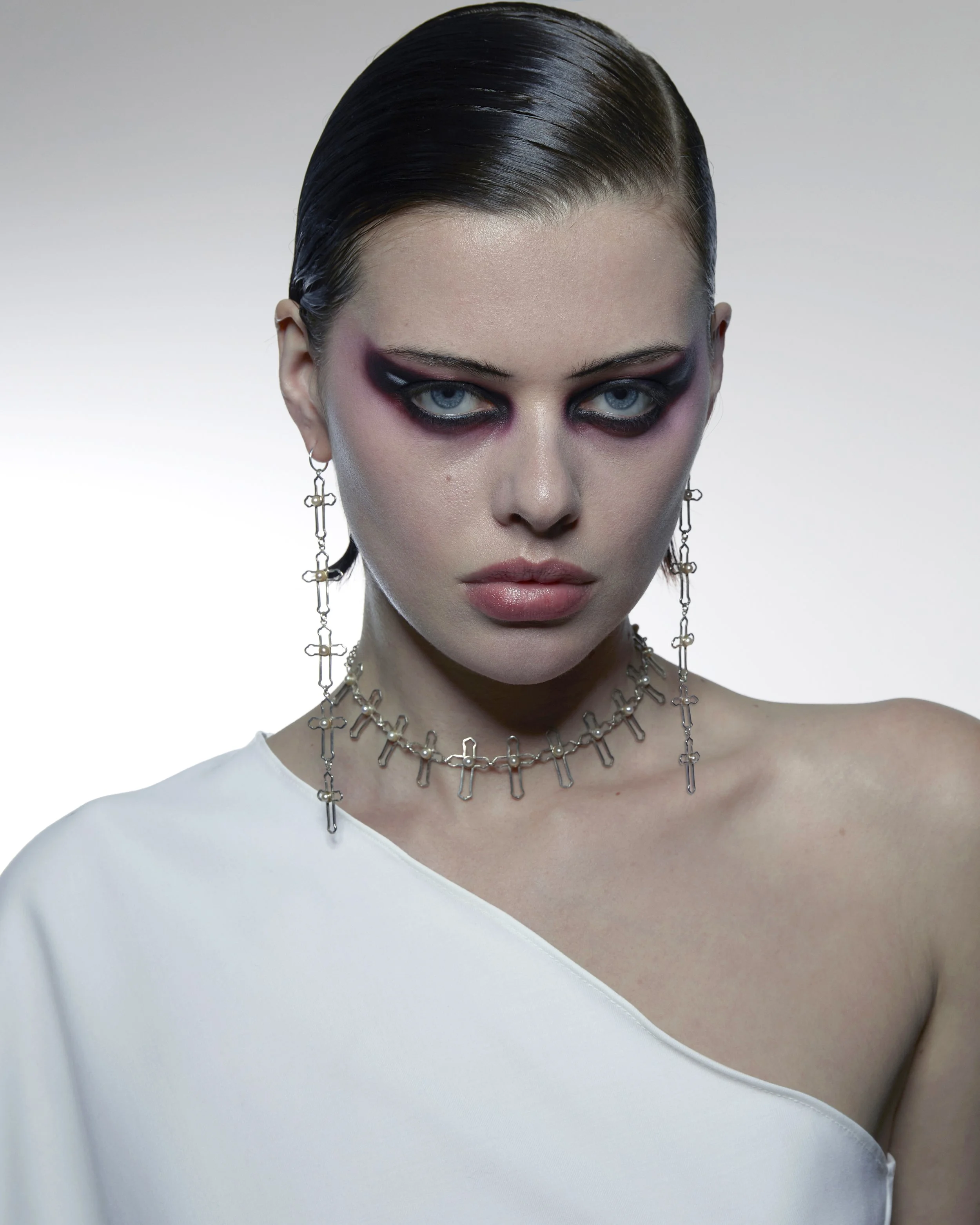 Five sterling silver crosses descend from one another to create a dramatic long earring. Each cross is adorned with a freshwater pearl.
